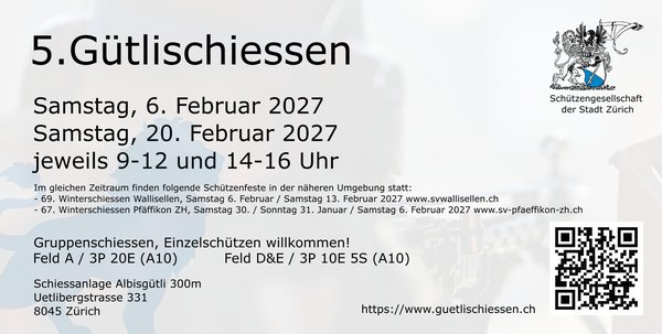 Die Schützengesellschaft der Stadt Zürich dankt euch für die Teilnahme im 2026 und möchte euch bereits jetzt schon herzlichst zum «5. Gütlischiessen 2027» einladen, mit der Hoffnung, dass unser Schiessanlass auch im 2027 den Weg in euren Kalender findet.